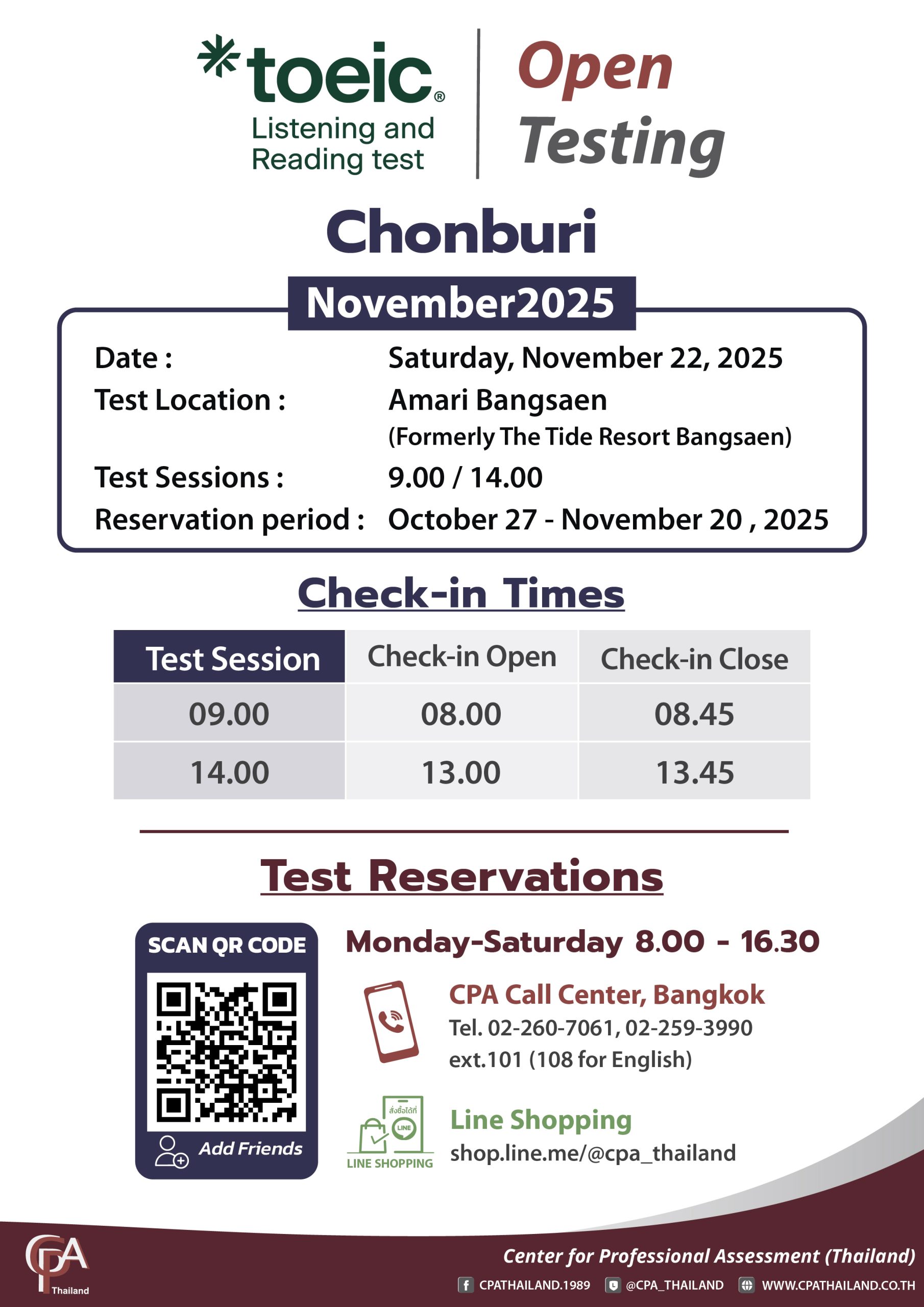 CPA (Thailand) จะดำเนินการจัดสอบ TOEIC Listening & Reading ที่ศูนย์สอบกรุงเทพฯ ศูนย์สอบเชียงใหม่ Open Testing และการจัดสอบนอกสถานที่ตามตารางสอบ