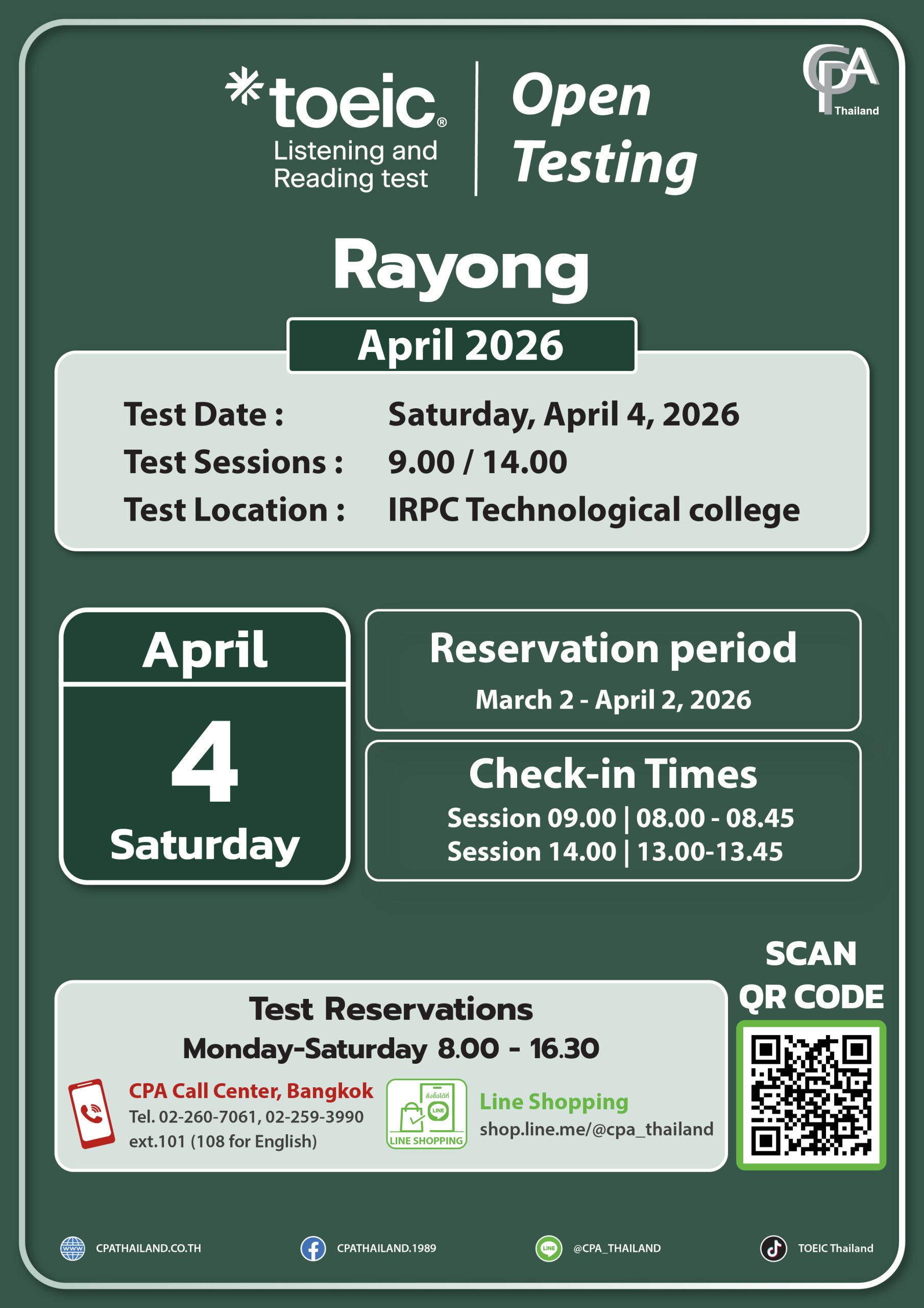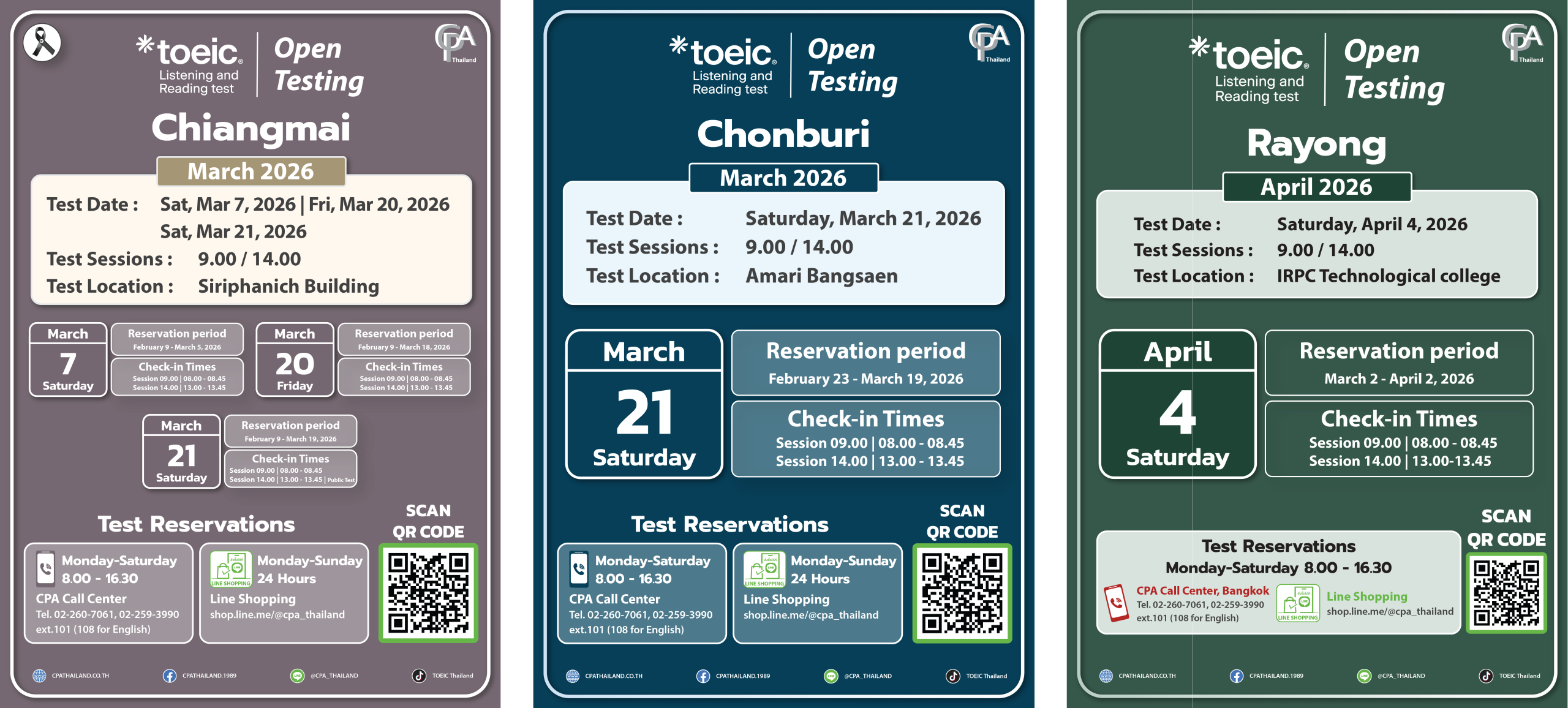 CPA (Thailand) จะดำเนินการจัดสอบ TOEIC Listening & Reading ที่ศูนย์สอบกรุงเทพฯ ศูนย์สอบเชียงใหม่ Open Testing และการจัดสอบนอกสถานที่ตามตารางสอบ