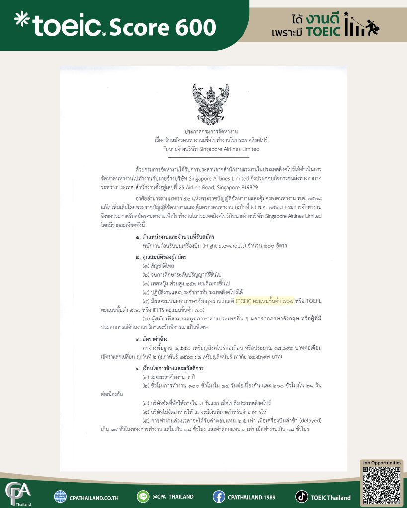 กรมการจัดหางาน รับสมัครคนหางานเพื่อไปทำงานในประเทศสิงคโปร์ กับบริษัท Singapore Airlines Limited
