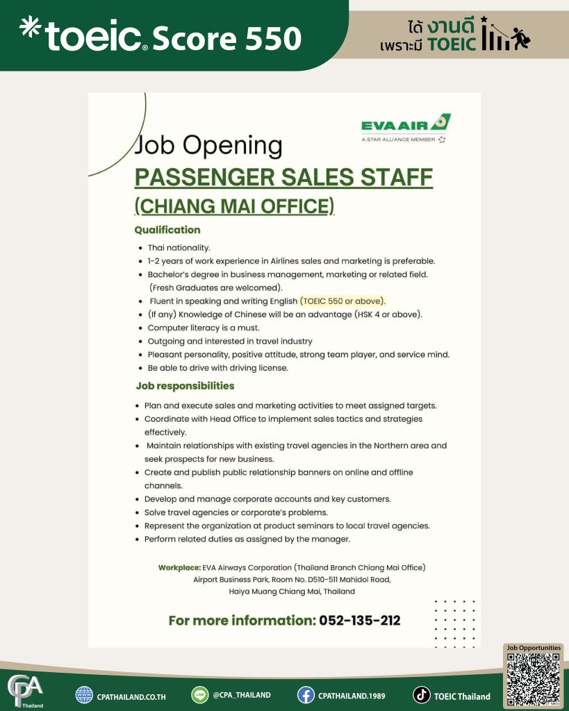 EVA AIRWAYS (Chiang Mai Office) Recruiting เปิดรับสมัครตำแหน่ง Passenger Sales